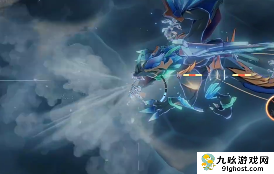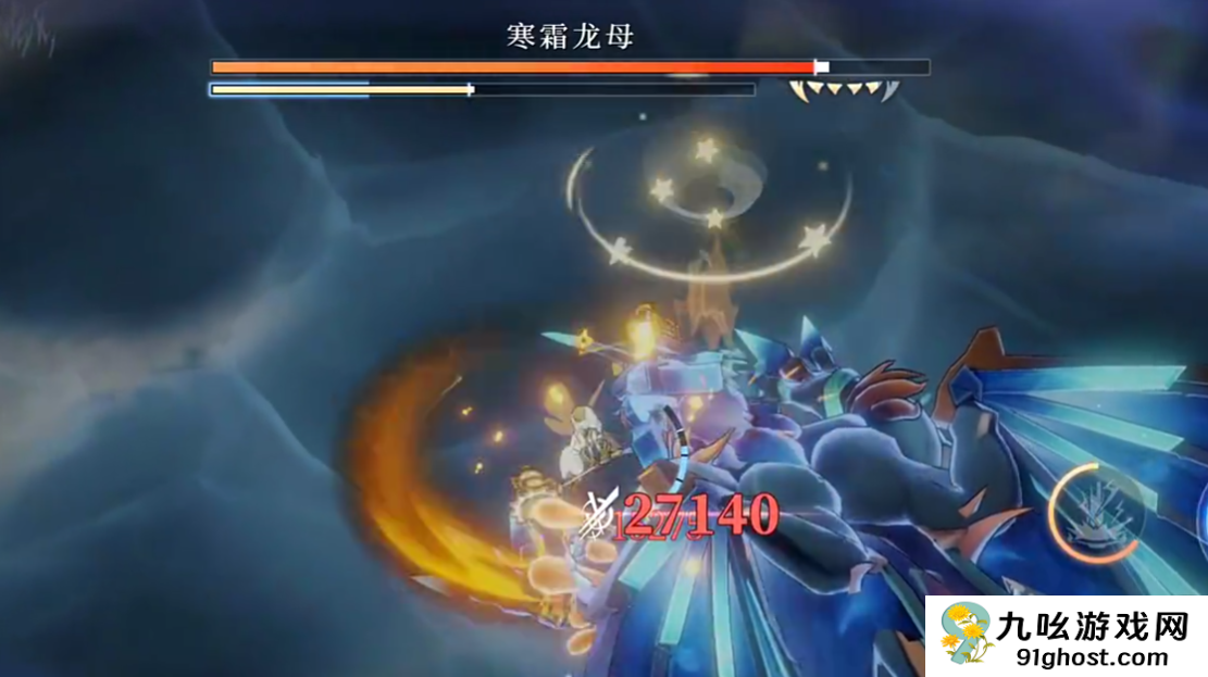 紧接其后,将释放逆时针方向90°角的寒霜喷射,具备冻结效果且伤害极高,建议根据龙头转动方向同步移动进行规避。之后BOSS升空盘旋一周后落地,并逐步释放向外蔓延的冰环,只要始终保持在冰圈扩散范围之外,即可避免受到致命打击。
