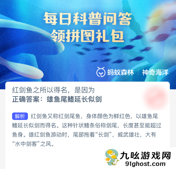 红剑鱼之所以得名,是因为?【神奇海洋】10月22日新题目已开答!正确答案现已公布,点击领取拼图,一起为修复海洋生态贡献力量!今日正确答案是:【雄鱼尾鳍延长似剑】。红剑鱼也叫红剑尾鱼,它们通体鲜红,正是由于雄鱼的尾鳍形状细长如剑,才获得了这个形象的名字。