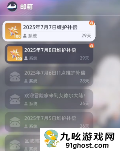 最后就是要参与游戏的开服活动,因为开服活动里面也会给到大家一些补偿以及福利,这里的话通过邮箱就可以看到目前的一些通知,因为辉石作为目前游戏当中比较用处比较多的货币,必然会出现在开发活动的补偿里面,这里给到补偿一般是在系统进行维护的时候就会给到的,而且一次性也会给很多,数量达到100~200个左右,参与此类维护的话,基本是不用大家怎么去花时间的,只要进行点击就可以拿到了。