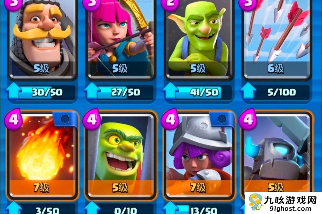 卡组的核心卡不变,一些不太重要的卡可以随赛季更换,所有卡组的搭配思路都是这样的。当我们开始用一套卡组打9000杯,每个月都能打满联赛的奖励时,随着我们积累的资源越来越多,基本上可以在后面多搭配几个卡组。前期因为资源稀缺,优先将一个卡组提升到满级,这是我们最大的提升,后期手里有足够的资源,不用怕浪费资源。如果没有资源提升主卡,可以组建一些娱乐卡组。