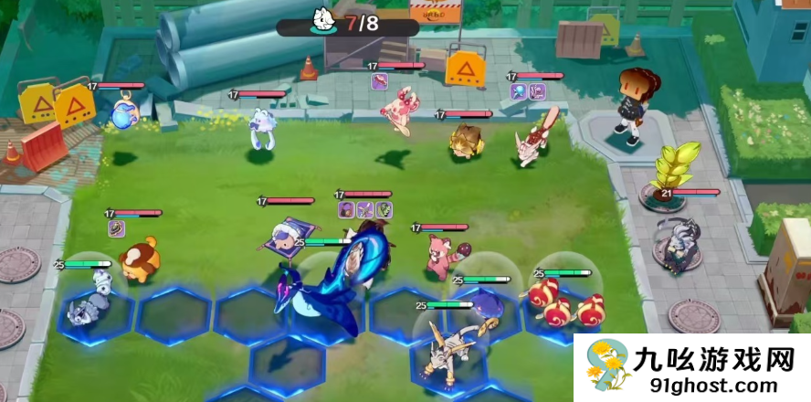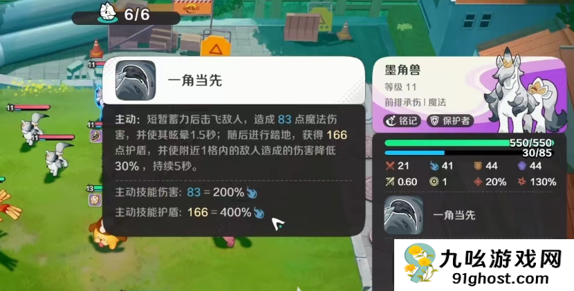 此时的话还会对这位敌人带来后续的1.5秒眩晕控制,控制达成之后,墨角兽还会进行一个踏地的动作,这个踏地动作是给他自身带来一个护盾,这个护盾保护他自身的同时,还可以给友军带来足够的保护能力,此时的保护能力并不是覆盖到全体队友身上的,而是使墨角兽周围一格以内的敌人都会得到伤害降低的效果,所以如果大家想要整体保护流的数值达到最高的话,其他的角色最好都要挨着墨角兽的定位来站,隔得太远的话,这个这技能就不生效了。