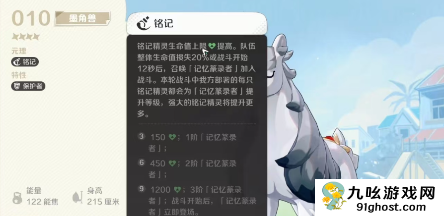 目前游戏当中铭记精灵他们数量越多,达到的羁绊百分比就越高,所以同属性的角色越多的情况下,召唤出来的这个生物也就越强大一些,而且正好目前铭记属性的精灵数量也是比较多的,所以新手的想要更多羁绊的情况下,是可以走这个流派的,想要达到满值也是可以的,Boss只需要战斗之后就立刻触发这个羁绊,带来召唤物的能力,目前根据精灵生命线上面上线的数值,队伍整体的生命数值也是20%,但是战斗一开始的12秒之后,就可以利用这个召唤物,带来一阶情况下150%的提升效果,二阶情况下450的提升效果,最高的情况下是三阶有1200的敌人效果。