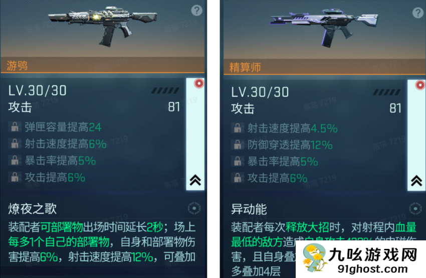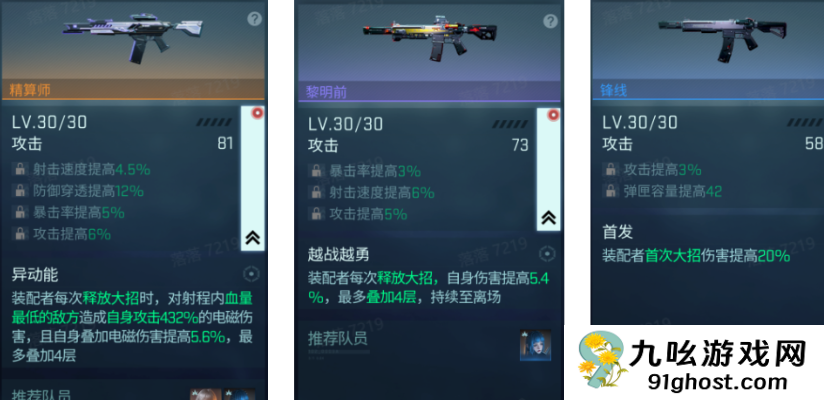 而比较优秀的两个SSR级的武器游鸮和精算师就是两个很不错的输出武器,前者拥有着燎夜之歌的专属能力,被装配后的角色可以使可部署物的出场时间延长2秒,并且在战斗场景中多出一个自己的部署,本身和部署物的伤害都提高6%,射击速度提高12%,并且此状态可叠加;而后者则是有异动能的效果,装配的角色在每次释放大招的时候都可以对射程范围内最低血量的敌方造成高达432%的自身电磁攻击伤害,而自身在叠加到电磁伤害后会提高5.6%,最高可以叠到四层,而有更多其他的装配解锁之后,游鸮和精算师都会拥有着更高的能力以及输出。