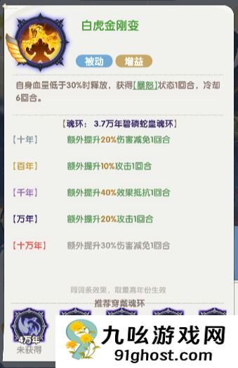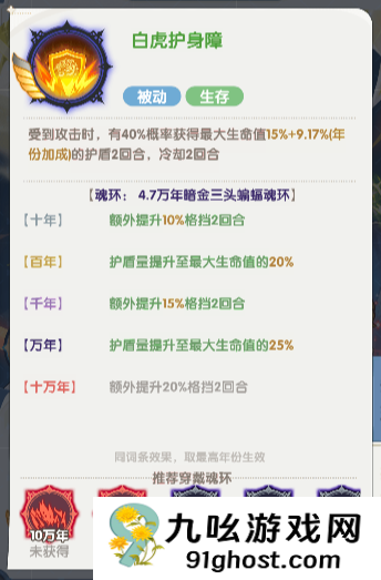 受到攻击时,有40%概率获得最大生命值15%+(年份加成)的护盾2回合,冷却2回合