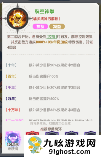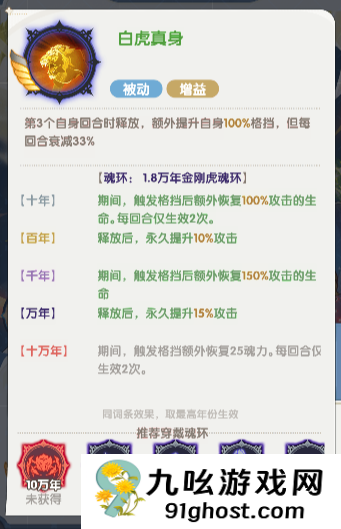 【十万年】期间,触发格挡额外恢复25魂力。每回合仅生效2次。