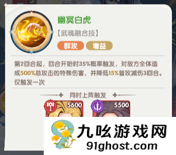 第2回合起,回合开始时35%概率触发,对敌方全体造成500%总攻击的特殊伤害,并降低15%普攻减伤3回合。仅触发一次