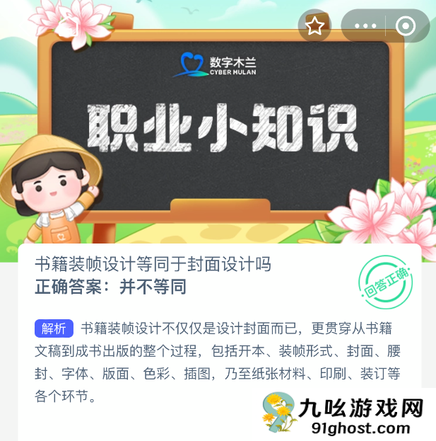 书籍装帧设计等同于封面设计吗?【蚂蚁新村每日一题】2025年10月27日题目已发布!坚持答题,积累木兰币,即可加速小镇建设。答对本题,立即可享“产速+3/时”的加速奖励!今天正确答案是【并不等同】。书籍装帧设计不仅仅是设计封面而已,更贯穿从书籍文稿到成书出版的整个过程.