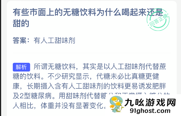 以上就是有些市面上的无糖饮料为什么喝起来还是甜的,支付宝蚂蚁庄园2025年10月27答案最新,更多精彩内容,请点击关注本站手游网更新!