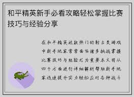 总之,和平精英是一款充满策略和技巧的游戏。通过不断练习和总结经验,灵活运用这些攻略和技巧,你就能在战场上所向披靡,成为和平精英中的佼佼者,享受游戏带来的乐趣与胜利的喜悦。
