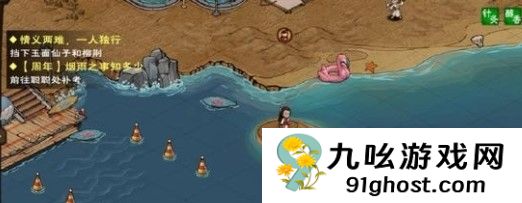 蓝鲸岛在姜妍湖中的位置是(17,31)。先去洛阳(23,21)找活动大使,再去杭州(15,9)搜湖上的船。