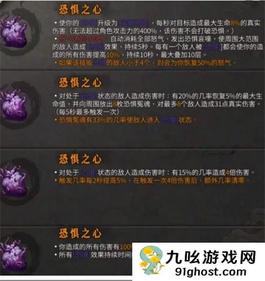 1、使你的恐惧升级为【深度恐惧】每秒对目标造成最大生命8%6的真实伤害(无法超过角色攻击力的400%,该伤害不会打破恐惧