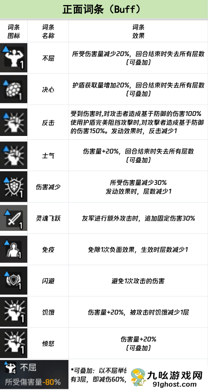 首先,正面词条中有两种非常独特的机制。不屈能够让你在受到伤害时减少20%的伤害量,这听起来像是个简单的防御提升,但需要注意的是它的持续时间并不长,每回合结束时会失去所有层数。不过,好在这个词条是可以叠加的,所以在连续的回合中,你可以通过不断叠加来减少伤害,让自己在战斗中保持更高的生存能力。