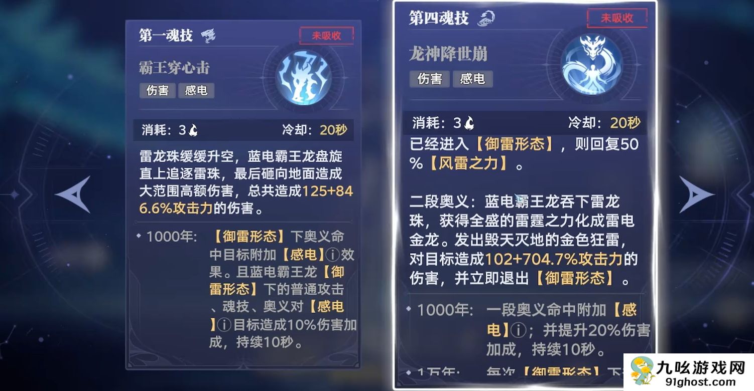 玉元星的蓝电霸王龙武魂很适合走感电流派,其第三魂技能积蓄风雷之力,充满后可令角色释放强化魂技飞天并进入御雷形态,该状态下角色全程霸体并能在天上飞翔,还能获得全新的攻击模组,玩家可在地面打满一套伤害后飞天,再将飞天的攻击模组打完后,回到地面继续打一套地面攻击模组,因此手感格外的丝滑,配合上第二魂技的范围高伤,会令玉元星的输出能力变得极为夸张。而在奥义的选择上,能打出两段奥义且能回复风雷之力的第四魂技更适合玉元星,玉元星也能通过它来令自己的技能循环变得更为流畅。
