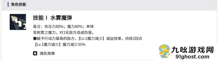 内布拉作为夏尔法家的第一位长女,她也是以大鹫团长诺吉尔的妹妹,也是诺艾尔的姐姐身份出现的,在游戏当中剧情里面出现的话,也是性格非常强势的一员,而她的行动能力上面,自然也撑起了性格上面那一方面的强势,在角色技能上面,第一个技能叫做水雾魔弹,这个魔弹技能使用的时候,带来的攻击数值以及魔力数值,都是80%的百分比在其中使用的,且都是针对一个单体敌人进行输出的,输出时她会发射本身的物质魔力,然后对敌人造成伤害,之后还会赋予目前行动力上面最高的一名敌方,给他带来一个减益效果,也就是魔力减少,这个效果会带来内布拉本身魔力数值上面35%的减少数值,而且后续两个回合里面,敌人都会受到这个魔力减少的效果影响。