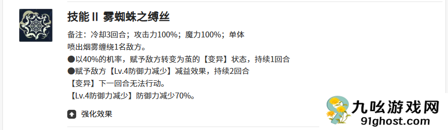 第二个技能叫做雾蜘蛛之缚丝,这个技能需要冷却3回合之后才能再一次使用,带来的攻击力以及魔力百分比是同样达到百分之百的,而且使用这个技能的时候也是对一个单体的敌人进行输出,此时的话内布拉会对目标喷出一段烟雾,这个烟雾会缠绕住一名敌方,此时会以40%的概率会将这个输出带来一个额外的状态,附加给敌人的这个状态叫做变异状态,也就是会将敌人直接转变为一个茧,后面一个回合当中,只要敌人保持在这个茧的状态里面就无法进行行动,此时还可以给敌方带来一个减益效果,这是根据目前敌方防御数值最少的一个敌人来作为他的目标,带来的防御减少效果是70%的防御数值,在减少之后,还会持续两个回合生效。