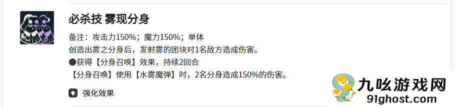 所以在此时,内布拉的这个简易生效之后,大家用队伍里面输出角色来进行攻击的话,防御力减少了70%之后,大家集合攻击的优势是非常大的,那么内布拉的必杀技叫做无限分身,使用这个技能的时候,带来的攻击力以及魔力的百分比是最高的,达到了150%,而且此时虽然是必杀技,但她同样还是对一个单体的敌人进行输出,此时内布拉在使用必杀技之后会创造出来一个雾之分身,这个分身会发射出来一些团块,对敌人造成输出之后还会获得一个分身召唤的效果。