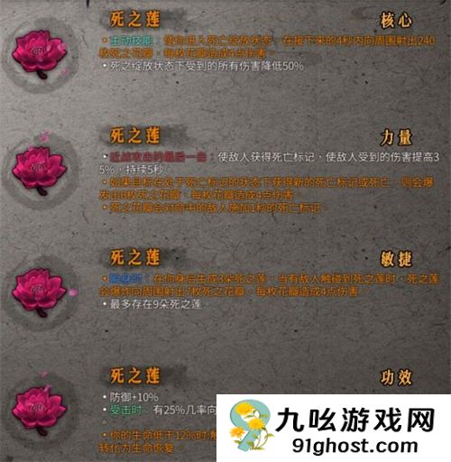 仅橙色品质:如果目标在处于死亡标记的状态下获得新的死亡标记或死亡,则会爆发出6枚死之花瓣,每枚花瓣造成X点伤害死之花瓣会对命中的敌人施加1秒的死亡标记。