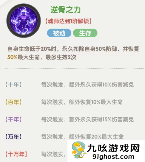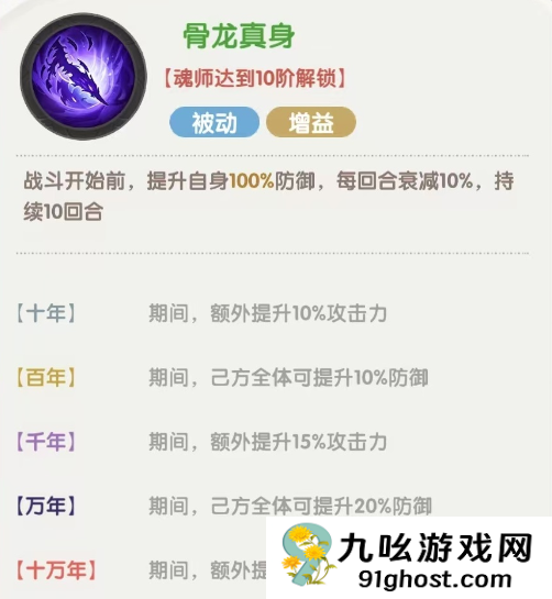 最后一个被动,战斗开始时直接提升100%的防御,最后每回合衰减10%,提升魂环后还有额外的攻击力提升效果。这个被动非常强势,尤其是应对开场爆发流的阵容时,可以更好的在前排承担住伤害,再配合上自身被动,能在场上生存很长时间。