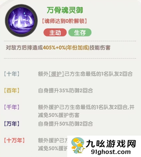 古榕的主动技能万古魂灵御,这个技能的效果比较出色,可以额外援护己方生命值最低的队友,同时提升自身防御,持续两回合。在援护己方生命值最低的队友时,有减免援护伤害的额外属性,这样提升自身防御,还能保护低血量的队友,大大减少了我方出现减员的可能性。尤其适合辅助单核输出型的阵容,有力保护后排输出。