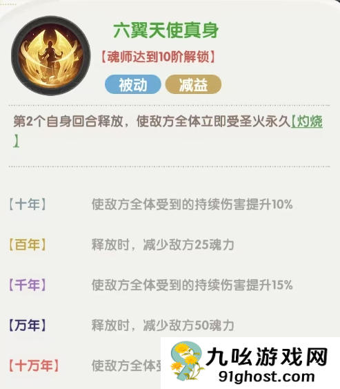 最后一个被动六翼天使真身,在第二回合释放,使得敌方全体受到灼烧效果,还能附加减少对方魂力,使对方全体受到持续伤害提升等附加状态。灼烧和审判都是属于持续伤害类型,二者的伤害属性并不相同,对于千道流来说,最佳的选择就是走持续伤害路线,配合上其他能够造成各种异常伤害的队友,这样就能将自身的全部被动都发挥出最佳效果,且前排非常能扛,打持久战也不怕。