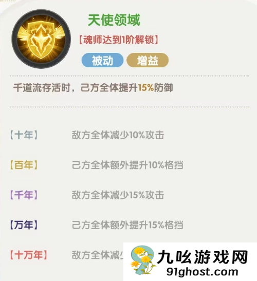 第1个被动天使领域,只要千道流存活,己方全体就能够获得高额属性加成,包括防御加成,减少敌方全体攻击力,增加全体格挡等。这个被动是千道流的核心被动,对于整个团队都是有效的加成,削弱对方攻击增加了己方防御,让后排可以更好地输出。