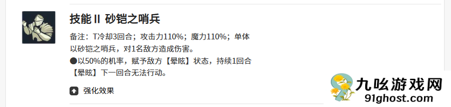 技能2叫做砂铠之哨兵,这个技能是有一定冷却回合的,每3回合才可以用一次,而攻击力上面能够带来的百分比会比上面的贯穿砂浆更强一些,这里达到的攻击力就可以达到110%,魔力数值上面也可以达到110%,虽然数值上面会比前一个技能更高,但是这也是一个单体技能,亚雷克德拉使用的时候同样对一个目标造成一定的伤害,此时伤害达成之后,还可以有50%的几率给敌人带来晕眩类型的控制,这个晕眩类型的控制在这里的话,持续时间不久,只有一个回合可以生效,也就是说晕眩成功施加给敌人之后,在下一个回合里面,该敌人是无法进行行动的。所以也可以用来打断敌方的连招节奏。