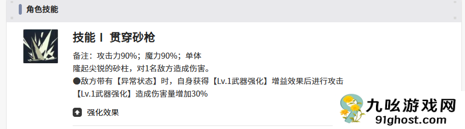 亚雷克德拉在技能当中有一个贯穿砂枪的技能,这个技能基础的攻击力能够达到90%,而在魔力上面能够达到90%,所以在基础攻击以及魔力输出上面能够达到的效果是比较平衡的,而且使用的输出目标是一个单体的目标,使用这个技能的时候,他会利用自己手中尖锐的沙柱进行输出,此时输出的话,除了基础的数值,还会根据敌方身上的状态来进行额外的判定,如果输出的时候选择的这个目标身上带有异常状态的话,那么亚雷克德拉他自身还会获得一个武器强化的效果,这个效果会作为一个增益来生效,后期他进行攻击的话,根据这个强化造成的攻击伤害数值会增加30%的数量,所以强化效果是非常不错的,特别是在攻击定位上面本身就需要攻击力加成的情况下,这个技能是可以放在新手的时候使用的。