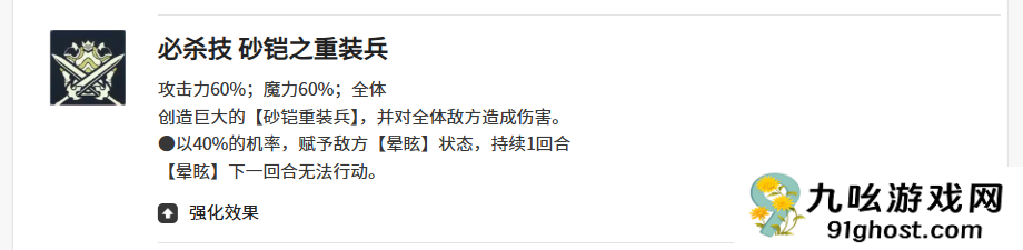 那么亚雷克德拉他在必杀技效果上面是砂铠之重装兵,这个技能的话其实相对来说百分比可能没有大家想象中那么高,因为在攻击力以及魔力上面达到的百分比都只有60%,但是相对来说这是一个全体输出类型的技能,所以覆盖范围可以说是非常高的,在使用的情况下,会带来一个巨大的重装兵,这个重装兵将全体的敌人都纳入他的伤害范围之内,此时在造成输出之后,还会有40%的概率,会给敌人带来一个很好的晕眩控制,所以相对来说,必杀技虽然带来的输出百分比比较低,但毕竟是一个全体输出技能,而且还可以同时跟上面的技能一起生效,带来明显的效果。