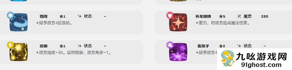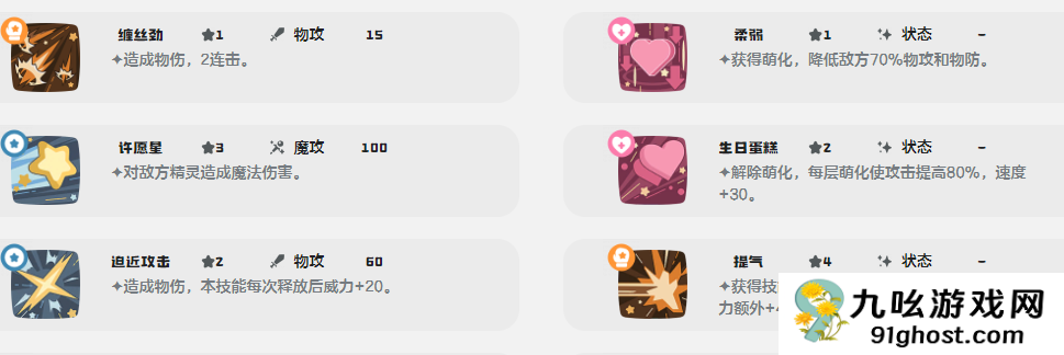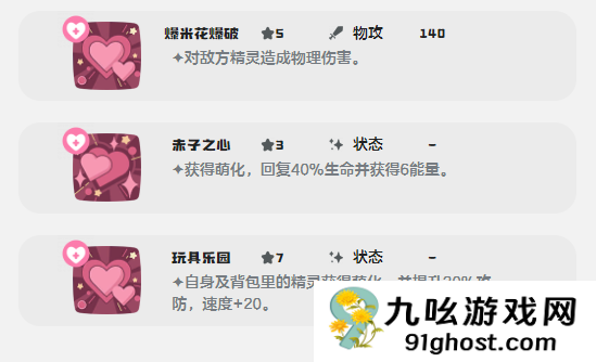 休息回复就可以直接回30%的血,作用于日常还是足够的。更厉害的是还有一个应激反应,普通的情况下大概就可以回25%的血,要是遇到对手防御反击,那就可以直接回80%的血。残血反打,那全部都需要靠他。另外还有一个赤子之心,不仅可以回40%的血,而且还可以获得6点能量。整体的性价比还是比较出色的,除此之外增益技能也是主要的亮点。柔弱可以把敌方的物理性攻击还有物理性防御直接下降70%就可以给我方创造出更多的机会。