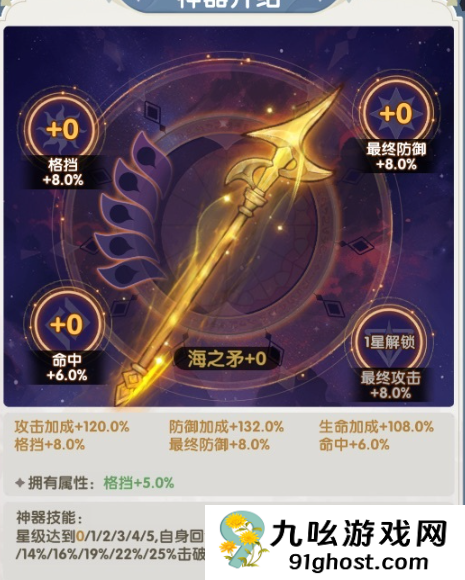 从属性面板上看,海之矛提供了攻击加成+120%、防御加成+132%、生命加成+108%,同时还带有最终防御+8%、格挡+8%、命中+6%。这些加成整体数值不算特别高,却覆盖了输出与生存的核心维度。