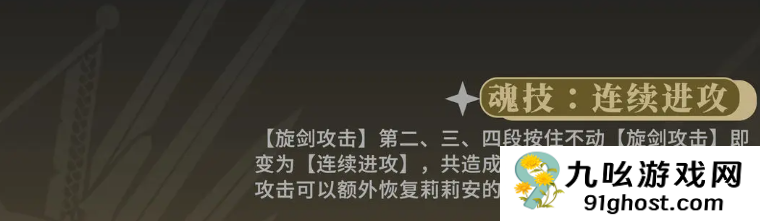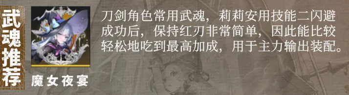 而且她连招上面闪避敌人攻击之后,还可以直接使用一个技能1,只要此时的技能1蓄力完全的话,后期达成的闪避输出动作是非常灵活的,因为刀剑类的角色,其实这里武魂的话,搭配的大部分是魔女夜焰这个武魂,此时进行武魂搭配,可以让莉莉安在使用技能2的时候闪避成功率更高一些,而且让她在保持自身状态的时候有更高的输出,所以使用这个武魂的话,莉莉是可以吃到她最高加成效果的。