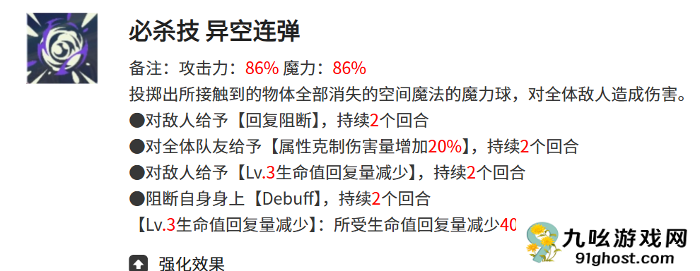 异空连弹是兰吉尔斯的必杀技能,该技能的攻击力和魔力均为86%,该技能使用后,兰吉尔斯会向敌人方向投掷出能够将所有接触的物品全都给消失的空间魔力球,空间魔力球在接触到敌人时,还会给敌人附加上回复阻断的效果和生命值回复量减少的效果,给我方全部的队友附加上属性克制伤害量增加20%的效果,最主要的是该技能可以直接将自身的Ddbuff给阻断。