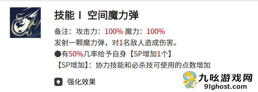 空间魔力弹和伯德家族的矜持是兰吉尔斯的主动技能,空间莫丹谈是一个攻击力和魔力均为100%的技能,这个技能可以对敌方1名敌人发送1颗带有着高额伤害的魔力弹,魔力弹命中目标的时候还有50%的可能性会给自身附加上1个sp,sp指的是协力技能和必杀技,sp增加后兰吉尔斯的协力技能和必杀技的可用点数都会出现增加。
