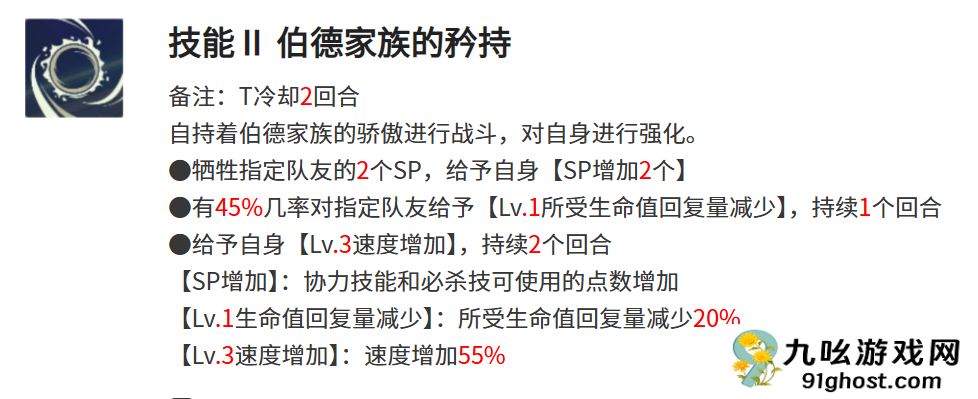 伯德家族的矜持这个技能是需要兰吉尔斯保持着伯德家族的骄傲去和对手战斗,该技能主要作用就是强化自身的能力了,使用该技能后,兰吉尔斯可以直接牺牲指定2名队友的sp,将牺牲队友的sp赋予到自己的身上,且还有45%的几率给队友附加上所受生命值回复量减少的效果,自身可以被赋予速度增加效果,sp点数也会随之增加。