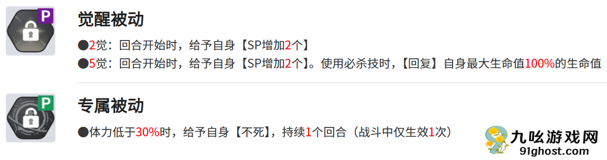 觉醒被动技能分为2觉和5绝,2觉能够给自己身上附加上2个sp,5觉在附加2个sp的基础上,兰吉尔斯使用必杀技后,还能恢复自身最大生命值100%的生命值,专属被动技能则是在兰吉尔斯的血量低于30%的时候,给自己赋予上不死的状态。