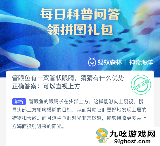 以上就是管眼鱼有一双管状眼睛,猜猜有什么优势?神奇海洋今天答案最新2025年10月30日分享,更多相关攻略内容,请点击关注本站手游网更新!