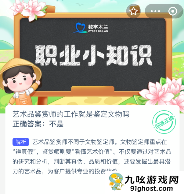 艺术品鉴赏师的工作就是鉴定文物吗?【蚂蚁新村每日一题】2025年10月30日题目已发布!坚持答题,积累木兰币,即可加速小镇建设。答对本题,立即可享“产速+3/时”的加速奖励!今天正确答案是【不是】。艺术品鉴赏师不同于文物鉴定师。文物鉴定师重点在“辨真假”,鉴赏师则要“看懂艺术价值”。