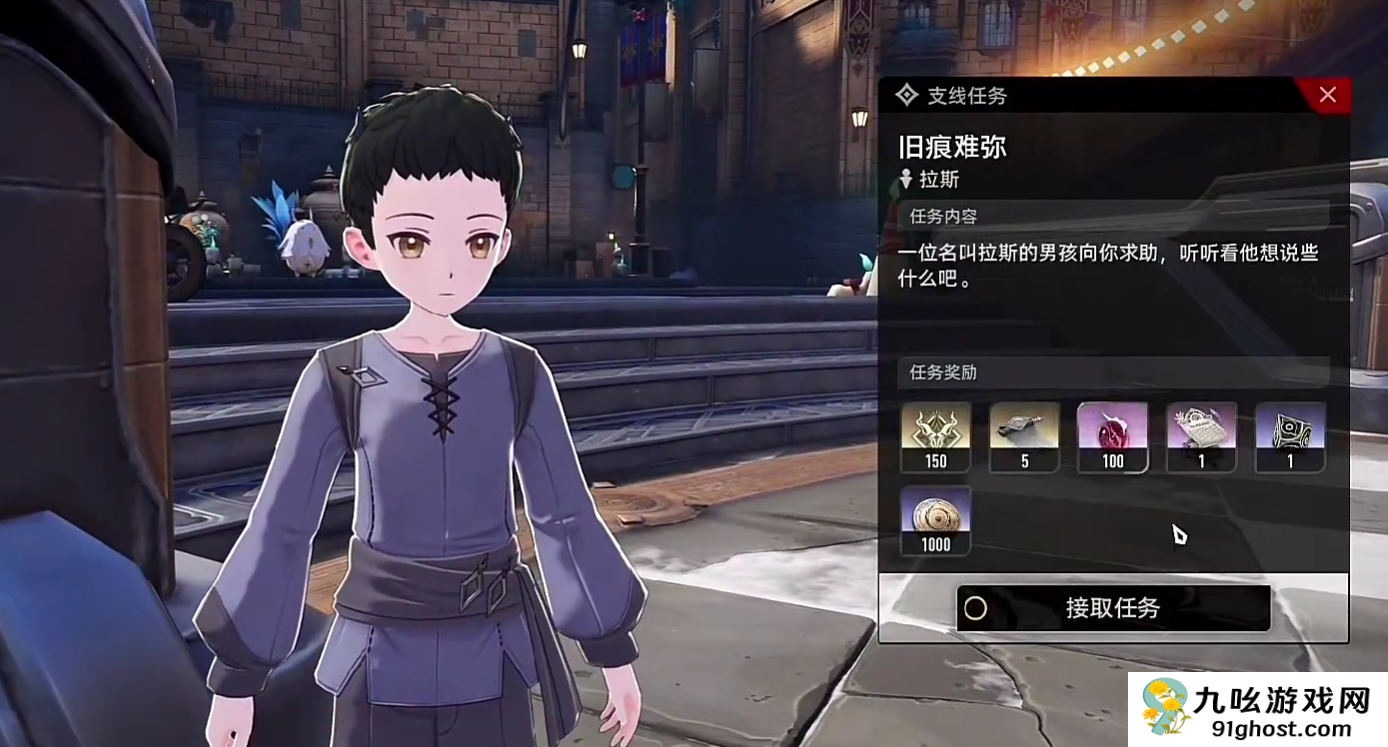 旧痕难弥支线任务的触发位置是,冰湖城东区的广场处,玩家在广场的中心寻找到,一位名为“拉斯”的小男孩,随后进行对话即可,在对话之后,玩家即可成功接取对应任务,任务完成时,玩家不仅可以获得游戏的大量货币,还能够取得角色经验值以及武器材料。