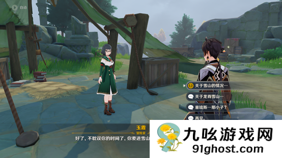 在营地和玉霞对话,询问雪山的情况,她会提到一种奇怪的冰堵住了道路,随后我们前往调查。