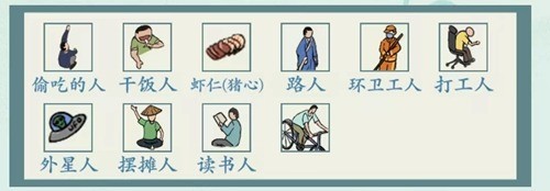 答案:偷吃的人、干饭人、虾仁、路人、环卫工人、打工人、外星人、摆摊人、读书人、骑车的人。