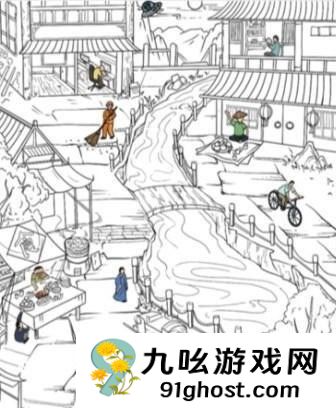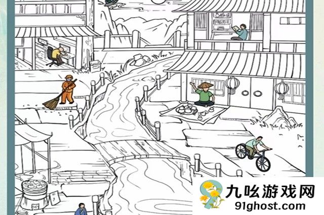 2、紧接着就是摆摊人、读书人、骑车的人,还有在左下角有一个干饭的人。
