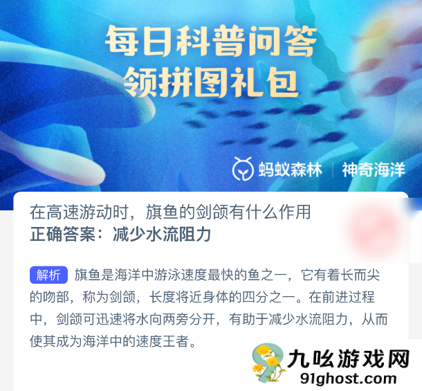 以上就是在高速游动时,旗鱼的剑颌有什么作用?神奇海洋今天答案最新2025年10月31日分享,更多相关攻略内容,请点击关注本站手游网更新!