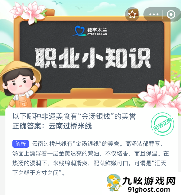 以下哪种非遗美食有“金汤银线”的美誉?【蚂蚁新村每日一题】2025年10月31日题目已发布!坚持答题,积累木兰币,即可加速小镇建设。答对本题,立即可享“产速+3/时”的加速奖励!今天正确答案是【云南过桥米线】。云南过桥米线有“金汤银线”的美誉。高汤浓郁醇厚,汤面上漂浮着一层金黄透亮的鸡油,不仅增香,而且保温。