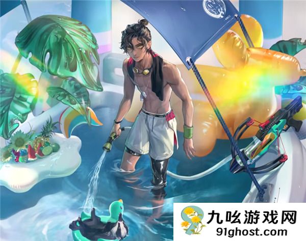 黑皮的狼獾露出他坚实的肌肉,穿着短裤,在泳池拿水枪逗弄身边的小蜜獾,旁边放着他的弩箭。小蜜獾躺在游泳圈里,看起来就很享受的样子。