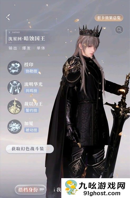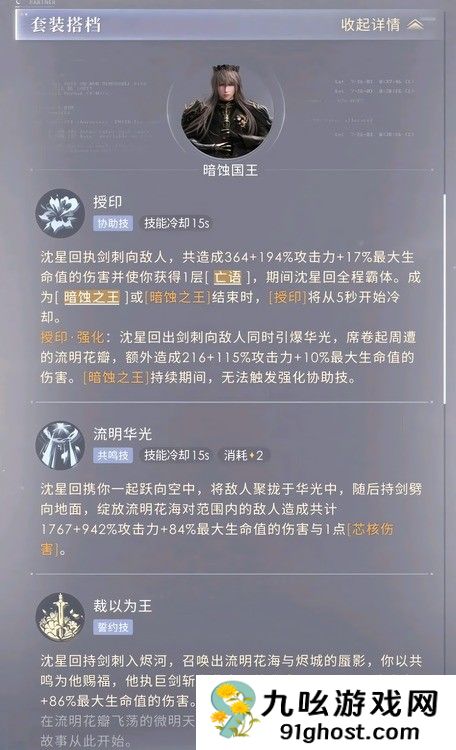 恋与深空暗蚀国王套技能怎么样?“暗蚀国王套”是沈星回的专属,其协助技术名称为“授印”,授印的CD是15秒,释放后沈星会用剑刺向敌怪。造成一定的攻击+血量百分比的伤害,同时让主角得到一层“亡语”buff。在剑的刺击过程中,沈星在整个过程中都处于霸权之中,当暗蚀之王状态开始或结束时,“印刷”CD将从5秒开始倒数。此外,印刷可以加强,强化后的刺击可以引爆华光,华光可以吹周围的流明花瓣,增加一定比例的血液攻击损伤。共鸣技术是“流明的华光”,沈星将带领主角一起飞向空中。