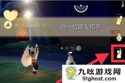 点击屏幕上方中间找到挥手动作,在朋友面前点击,完成挥手。