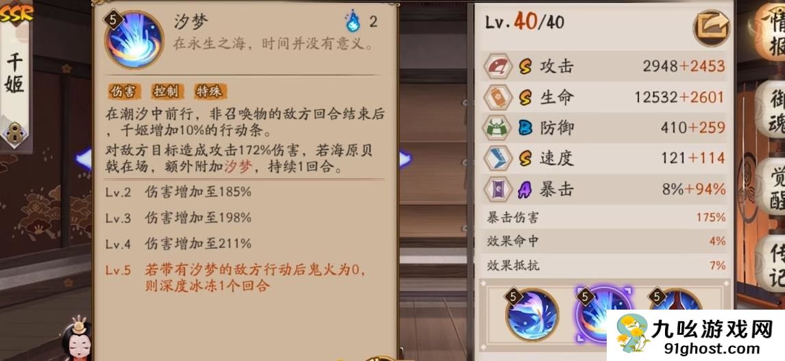 但需要注意的是,二技能的扣火减益状态需要在千姬插入贝戟后加入,这种状态具有不可驱散、不可禁用的特点。在实战中,建议优先向需要高频消耗鬼火的敌人释放二技能,通过卡鬼火供应限制技能释放,为翻身创造条件。如果是针对敌人的双拉阵容,比如以拉条神驱动节奏的阵容,可以搭配轮入道御魂。