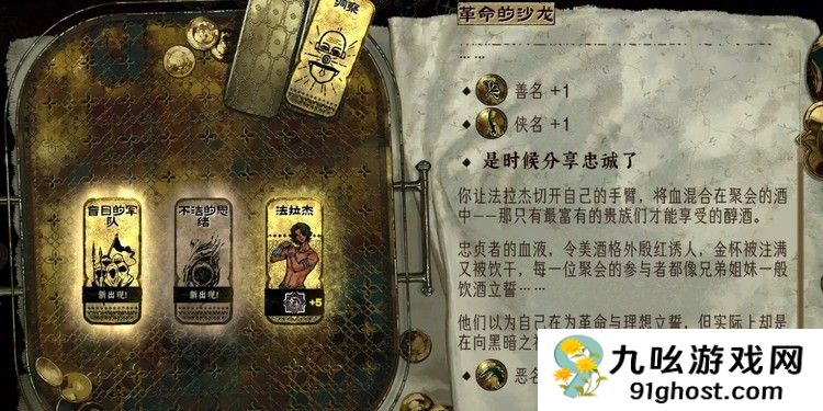 第三个是“白肚皮”,需要建一个房子,触发抓贼的情节,把主角和杀戮卡放进去,你可以打破银色及以下,第四个名字叫“赤裸裸的茶会”,你必须先去奴隶市场买瑞尔,如果市场已经燃烧,帮助瑞尔在妓院时间,触发茶会后,你可以得到2个罪行,3个诽谤,2个侠义名称,它还将扣除1个好名字,让快乐的博物馆关闭,同时折叠银杀死及以下,第五个是“革命沙龙”,以确保你的侠义名称≥18.并且在前期做过“危险派对”任务,才能触发沙龙,它可以增加1点恶名,5点权力,扣除1点法拉杰的魅力。