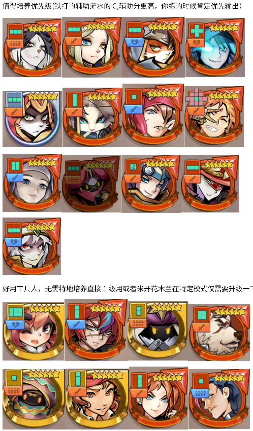 1星可用,随缘升星,开荒神卡,前期清兵回怒治疗一体,以下工具人无需特别培养无需装备,米开花木兰可以保留一下等级就行;
