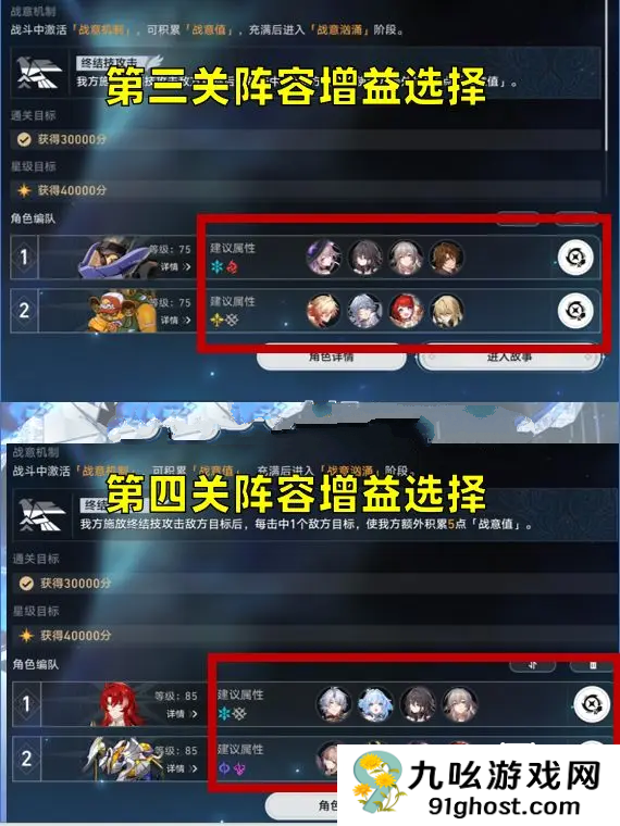 2. 第四关上半虽需手动微操但稳定2W+分:选用【白厄+刻律+阮梅+记忆主】+【追想】;下半满分挂机阵容:【小黑塔+腾荒+大黑塔+缇宝】+【追想】